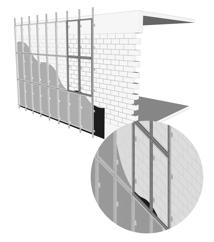 Ao contrário do Sistema AlphaVent PRO e AlphaVent SLIM, a fixação das placas deste Sistema é feita exclusivamente com o uso de selantes estruturais de alta performance, porém com um aumento importante de superfícies de adesão, o que garante a mesma sustentação.